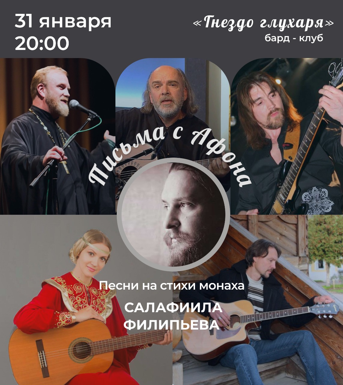 В концертной программе прозвучат песни на стихи афонского монаха Салафиила Филипьева в исполнении известных музыкантов - протоиерея Геннадия Ульянича, Стаса Бартенева, Олега Лагуткина, Евгения Фокина, Вячеслава Копорина, Юлии Славянской.