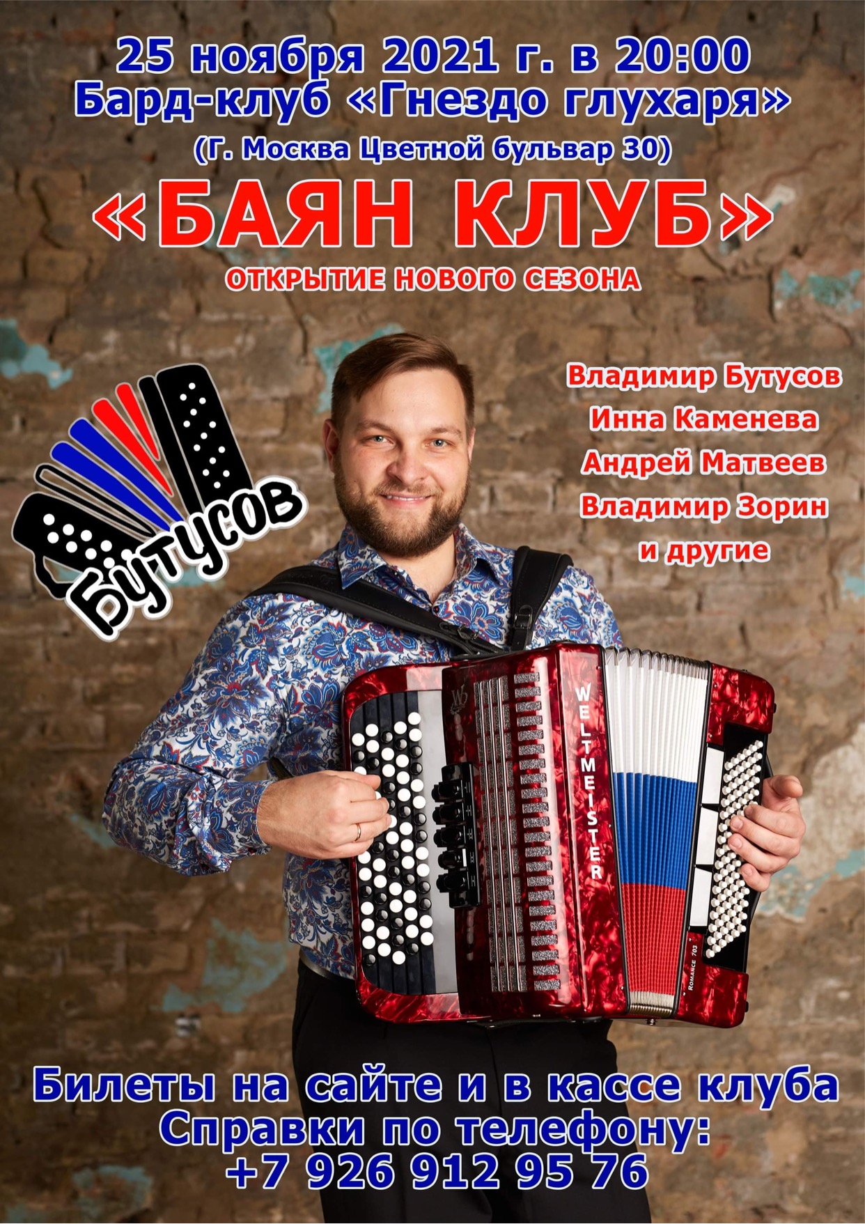 28 октября , город Москва, бард клуб «Гнездо глухаря» представляет открытие нового сезона «БАЯН КЛУБА». В концерте принимают участие: руководитель проекта Владимир Бутусов, а так же постоянные участники клуба: Инна Каменева (народный вокал), Андрей Матвеев (балалайка), Владимир Зорин (автор исполнитель) и другие. В программе авторские песни, а так же популярные композиции в собственных аранжировках. Во втором отделений Владимир Бутусов и все участники исполнят со зрителями самые душевные и любимые песни. Заряд позитива и отличного настроения обеспечен. Билеты на сайте и в кассе клуба. ! Ждем вас!