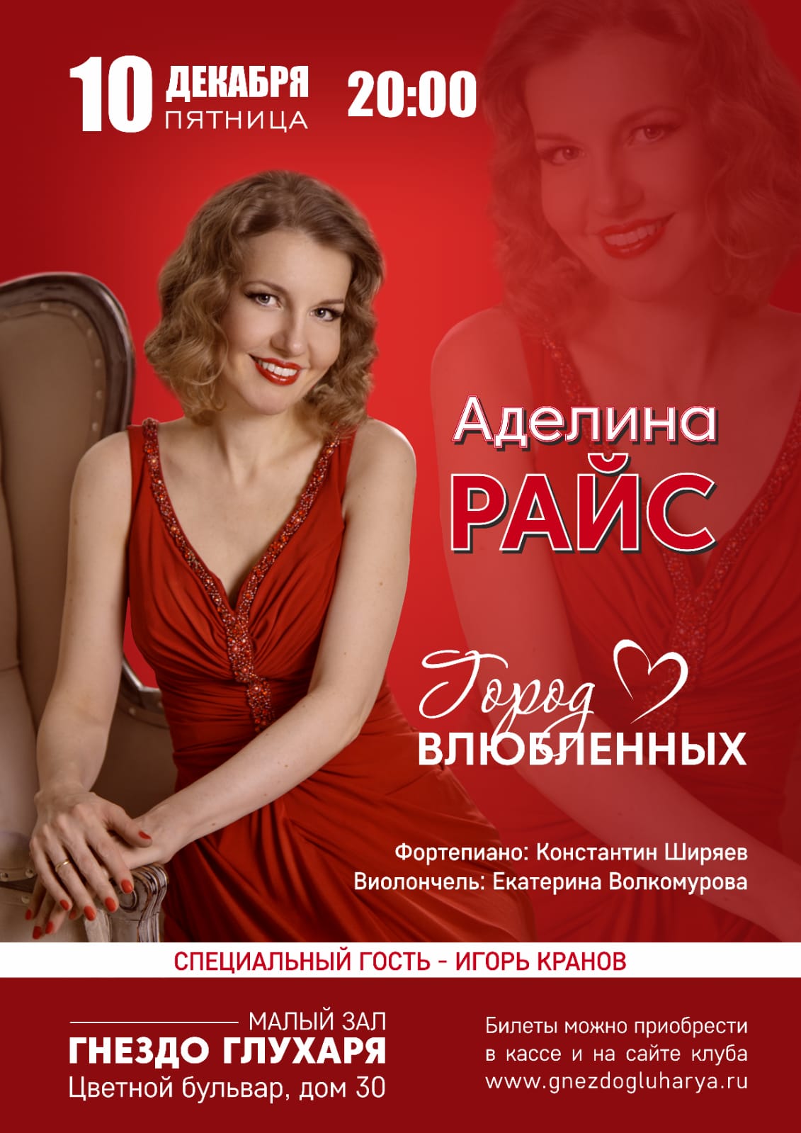 В программе «Город влюбленных» прозвучат авторские песни и стихи Аделины Райс, песни на стихи М. Цветаевой, А. Ахматовой, Р. Рождественского, В Брюсова, а также всеми любимые советские лирические песни А. Пахмутовой, И. Дунаевского, М. Минкова и др.