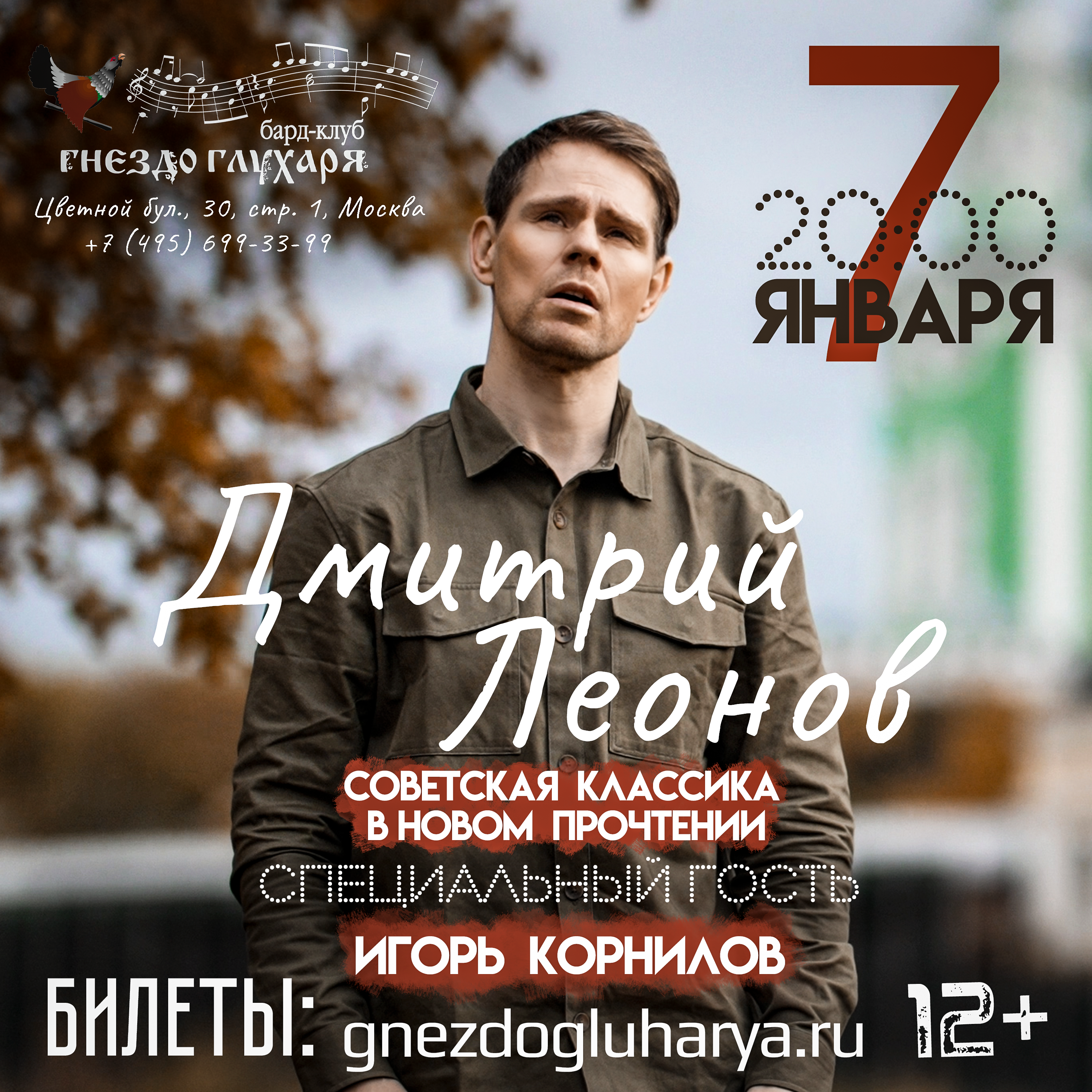 7-го января со сцены бард-клуба «Гнездо Глухаря» прозвучат любимые песни советских лет в живом исполнении, композиции из любимых кинофильмов и знаменитые хиты метров великой эпохи: М. Магомаева, В. Ободзинского, Е. Мартынова и многих других.