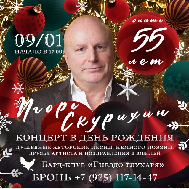 Популярный российский актёр и автор-исполнитель Игорь Скурихин отмечает свой Юбилей. Артиста поздравят его друзья Андрей Алексин, Гиа Гагуа, группа "Унесённые ветром" Евгения Рассказова, Сергей Избаш и другие, как всегда будет ярко, весело интересно.