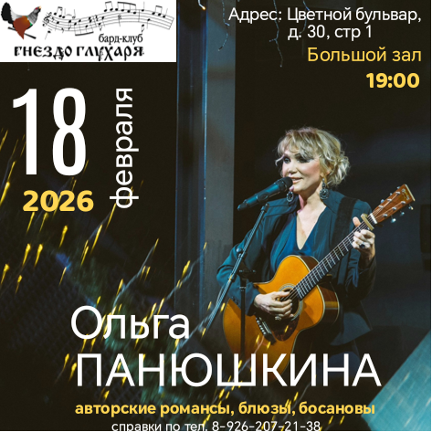 В программе творческого вечера Ольги Панюшкиной новые авторские песни в акустическом звучании в сопровождении гитары и любимые хиты в аранжировке Алексея Хвацкого.