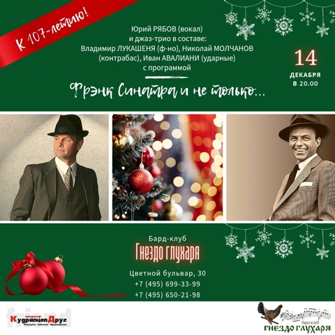 Несомненными авторитетами и кумирами музыканта были и остаются Энди Вильямс, Энгельберт Хампердинк и, конечно, Фрэнк Синатра, 100-летний юбилей которого отмечают во всем мире. Именно ему посвящает свое выступление Юрий Рябов.