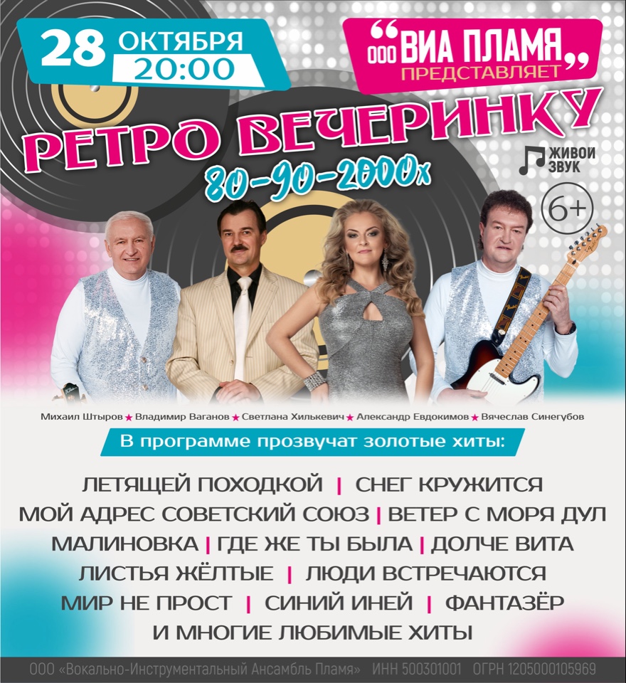"Ретро-вечеринка 80-90-2000х "- вновь погрузит в атмосферу, где вы сможете насладится красотой и нежностью мелодий того времени в оригинальном исполнении. А так же петь, танцевать обязательно и вспоминать молодость!!!